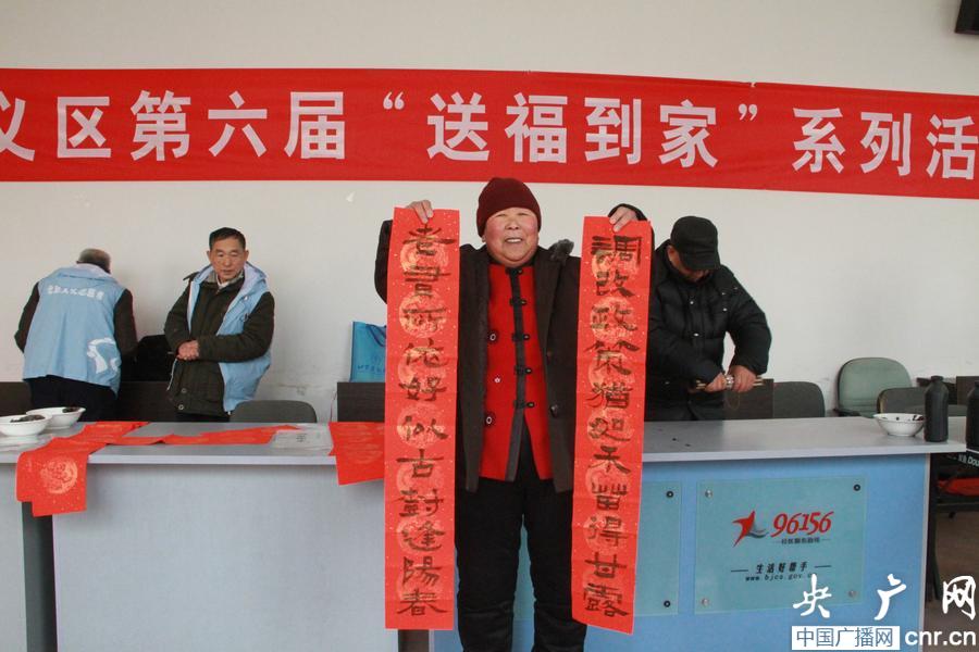 央廣網(wǎng)北京1月24日消息(記者李文蕊 通訊員李明磊)1月23日是中國傳統(tǒng)的小年兒,值此新春佳節(jié)之際,北京順義文委與北石槽聯(lián)手在中灘營村開展小年“送福到家”活動。現(xiàn)場一片熱鬧景象,來自當?shù)匚幕^的6位書法家一刻不停,為村民寫了300多副春聯(lián)和“!弊郑簧俅迕褚藢β(lián)還覺得不夠,請求書法家們再多贈幾個“福”字。