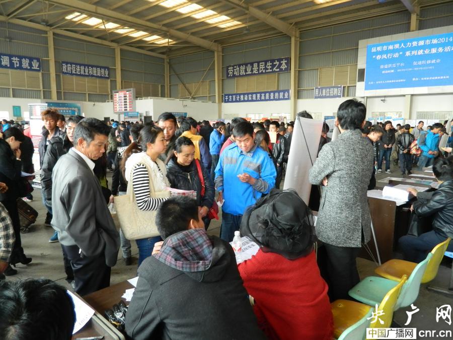 昆明市南壩人力資源招聘市場(chǎng)這幾天人頭攢動(dòng)、非常熱鬧,恰逢春節(jié)后集中用工和求職的高峰期,每天都有近5000人來(lái)找工作,而招工單位也超過(guò)了450家,共提供了3800多個(gè)崗位,工種以服務(wù)員、洗碗工、廚師、保安等服務(wù)類為主。二十歲出頭的謝興周11號(hào)這天第一次來(lái)到招聘市場(chǎng),他的意向工作是司機(jī),他認(rèn)為隨著物價(jià)上漲,去年大概2800元的工資今年應(yīng)該至少漲到3000元才能達(dá)到心理預(yù)期。