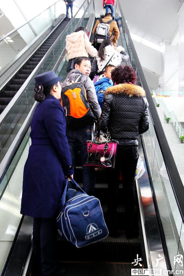 2月13日,離2014年春運結束還有11天,溫州南站的兩層候車室里旅客比高峰期明顯少了很多。赫蕓穿著藍色的鐵路制服,在一、二層候車室、站臺之間來回奔忙著。