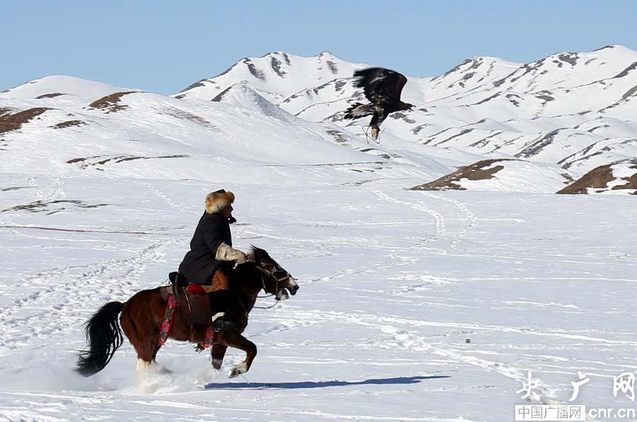 央廣網(wǎng)青河2月17日消息(記者張雷 青河臺記者拉扎提 葉斯波力)新疆阿勒泰地區(qū)青河縣昨天舉辦第二屆“獵鷹比賽”,40多名身騎駿馬、手臂上高舉獵鷹的馴鷹人和近萬名觀眾冒著零下30度的嚴寒參加、觀賞這場別開生面的比賽。