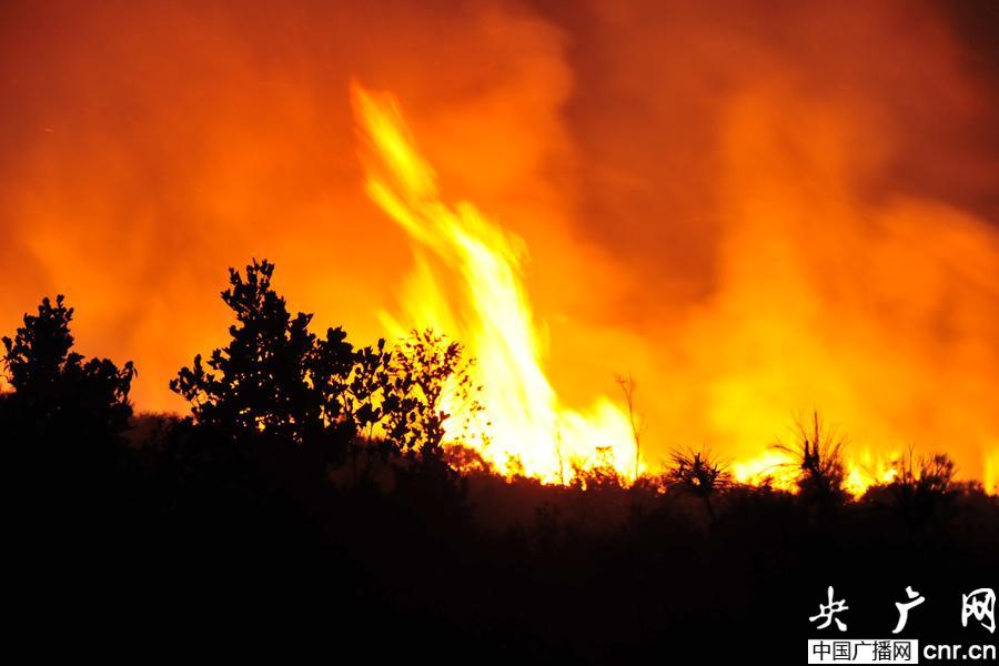 央廣網(wǎng)昆明3月13日消息(記者李健飛 通訊員龔龑)2014年3月12日凌晨1時30分左右,云南祿豐縣勤豐鎮(zhèn)馬關(guān)營村委會王家尖山發(fā)生森林火災(zāi)。昆明、楚雄兩地近2000余人參與撲救,國家森林防火指揮部緊急調(diào)派1架米-26直升機在火場實施吊桶滅火作業(yè)。圖為武警昆明森林支隊在現(xiàn)場全力撲救。