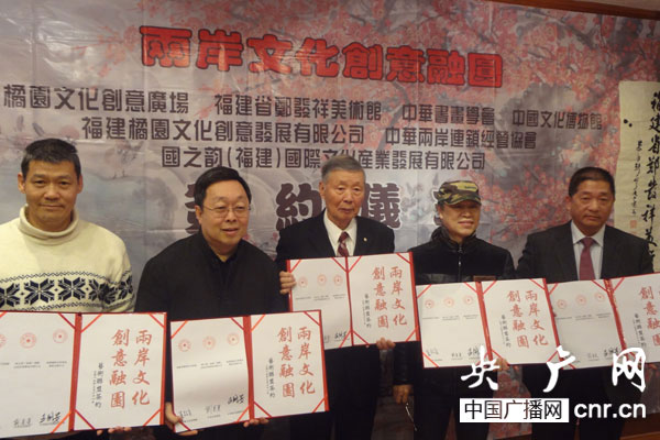 在臺(tái)北舉辦聯(lián)合簽約的有兩岸十多家文化產(chǎn)業(yè)單位和團(tuán)體,包括:福建橘園文化創(chuàng)意廣場(chǎng)、福建省鄭發(fā)祥美術(shù)館、國(guó)之韻(福建)國(guó)際文化產(chǎn)業(yè)發(fā)展有限公司、福建橘園文化創(chuàng)意發(fā)展有限公司、臺(tái)灣中國(guó)文化統(tǒng)一促進(jìn)會(huì)、臺(tái)灣中國(guó)文化博物館、臺(tái)灣中華書(shū)畫(huà)學(xué)會(huì)、中華兩岸連鎖經(jīng)營(yíng)協(xié)會(huì)、臺(tái)灣海峽兩岸文教經(jīng)貿(mào)交流協(xié)會(huì)、臺(tái)灣中華微型創(chuàng)意協(xié)會(huì)等。它們將共同組成兩岸文化聯(lián)盟,為加強(qiáng)海峽兩岸文化創(chuàng)意的交流譜寫(xiě)新的樂(lè)章。