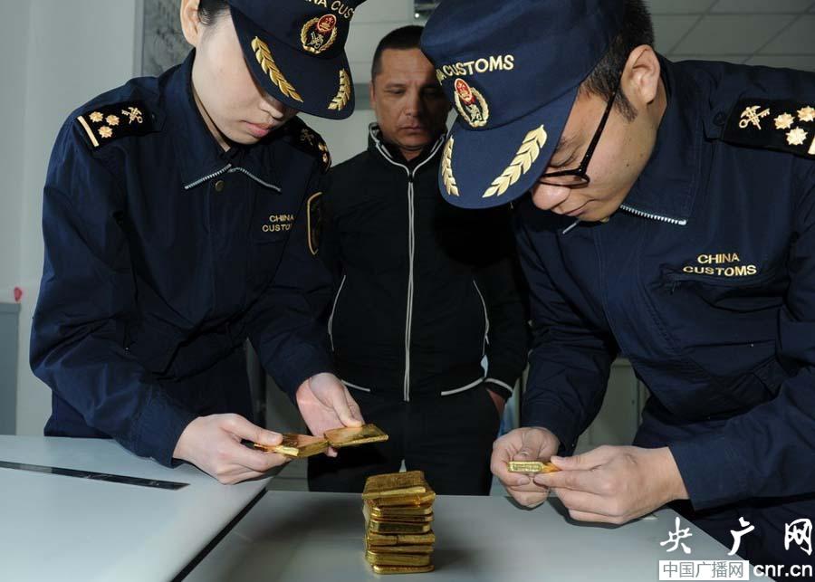 霍爾果斯海關(guān)關(guān)員查獲涉嫌走私黃金7.75公斤(央廣網(wǎng)發(fā) 李愷攝)