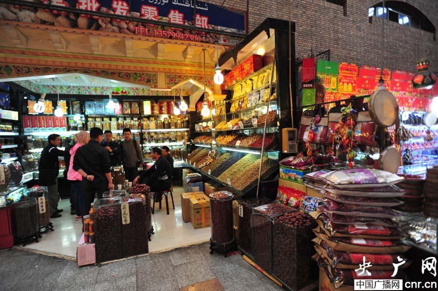 5月22日上午11點(diǎn)20分,游客在新疆國際大巴扎購買新疆特產(chǎn)(央廣網(wǎng)記者 張雷 攝)