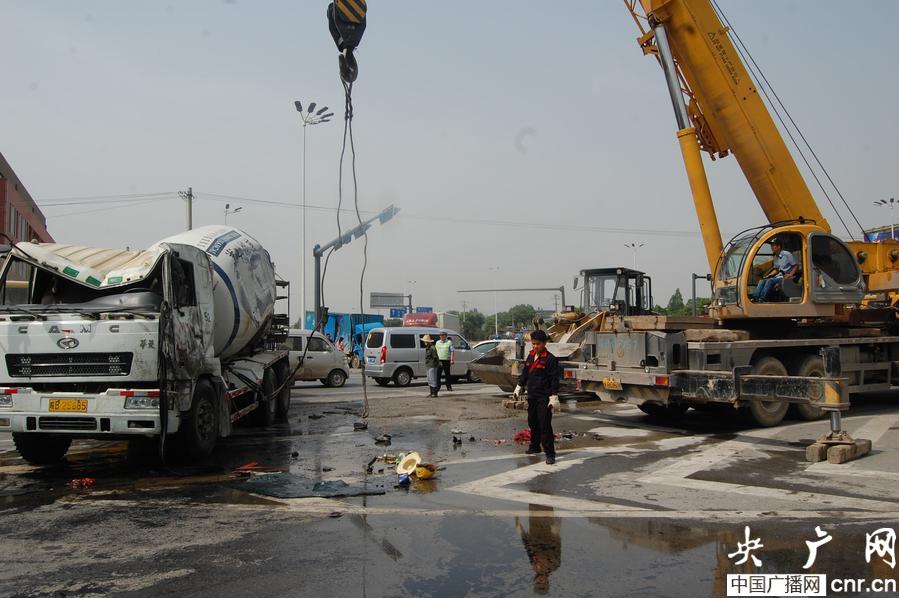 根據(jù)現(xiàn)場初步勘查,事故極有可能是攪拌車駕駛?cè)藶楸茏層肄D(zhuǎn)大貨車緊急向右打方向,致使其側(cè)翻后撞到紅燈等候的1輛轎車和3輛電瓶車,造成電動車上4人受傷、攪拌車駕駛?cè)耸軅囕v損壞嚴(yán)重,F(xiàn)場汽油泄漏嚴(yán)重,經(jīng)過交警、消防共同努力,通過水槍沖洗、疏散群眾等方法,稀釋了空氣中汽油含量,預(yù)防了烈日天氣下火災(zāi)發(fā)生。