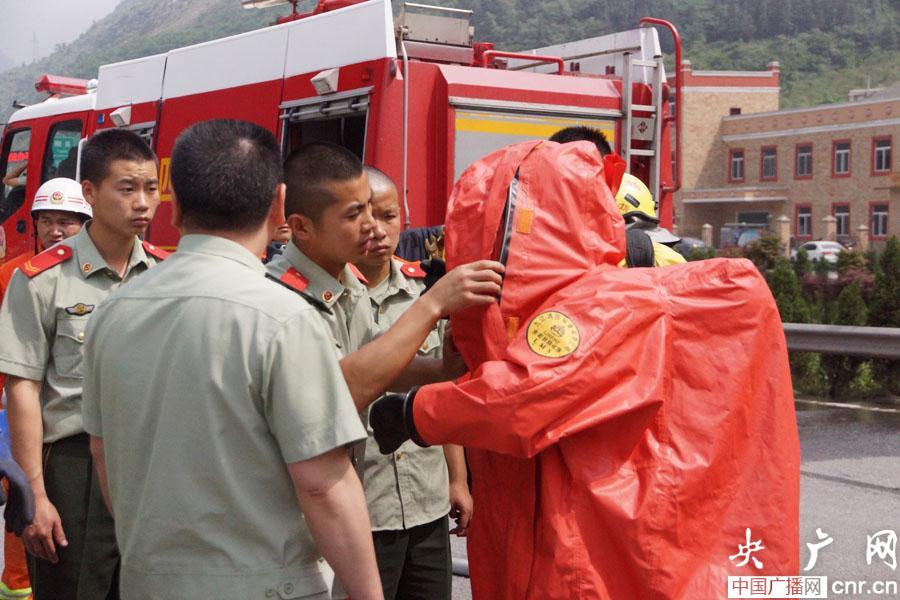 9時(shí)15分許,就近的映秀專職消防隊(duì)2車10人到場(chǎng)進(jìn)行前期處置;9時(shí)55分,汶川消防中隊(duì)3車16人增援到場(chǎng)。經(jīng)現(xiàn)場(chǎng)偵查發(fā)現(xiàn),消防官兵發(fā)生泄漏的罐車載有30.6噸丙烯酸,因后車追尾,致使安全閥損壞而泄漏;根據(jù)這一情況,現(xiàn)場(chǎng)指揮部決定架設(shè)水槍陣地對(duì)罐體冷卻,對(duì)泄漏化學(xué)品進(jìn)行稀釋,同時(shí)在水槍保護(hù)下,利用無(wú)火花工具進(jìn)行堵漏。10時(shí)45分,堵漏成功,消防官兵繼續(xù)對(duì)事故車輛進(jìn)行監(jiān)護(hù)。