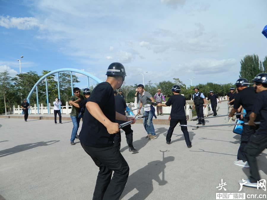 反恐演練的內(nèi)容是:兩名“暴恐分子”手持管制刀具強(qiáng)行闖入校園,門衛(wèi)阻攔無果,報(bào)警組迅速觸發(fā)校園一鍵式報(bào)警器,同時(shí)通知學(xué)校指揮組,迅速向 110報(bào)警。