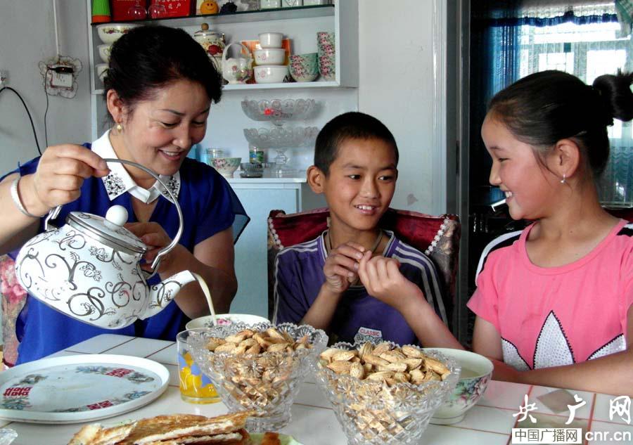 達(dá)尼婭給王克杰倒奶茶,女兒米娜給王克杰干果吃(孫忠玉攝)