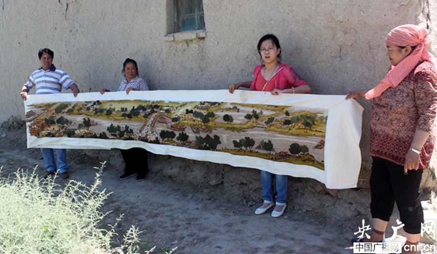 村婦代會(huì)主任馬桂英說(shuō):“只要有時(shí)間,就會(huì)看見(jiàn)她在繡,去年冬天,鎮(zhèn)上組織我們村婦女學(xué)手工編織,她白天學(xué)編織,晚上頂著頭燈繡,我們都說(shuō)她入魔了。后來(lái)從塔城來(lái)的編織老師無(wú)意看見(jiàn)了她的《清明上河圖》,當(dāng)時(shí)還沒(méi)繡完呢,老師就要花60萬(wàn)買(mǎi)下來(lái),說(shuō)是這么多年從來(lái)沒(méi)看過(guò)手藝這么好的十字繡。”