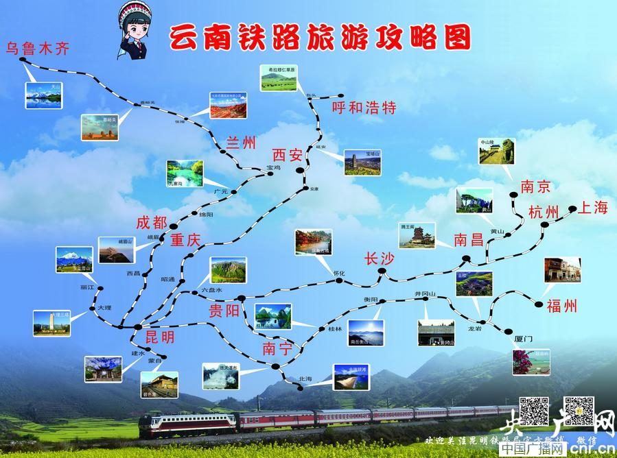 為了方便廣大旅客乘火車旅游,昆明鐵路局收集了從昆明始發(fā)的各趟列車沿線的景點資料,設(shè)計制作精美的鐵路旅游攻略圖,讓旅客輕松成為鐵路旅游達人。