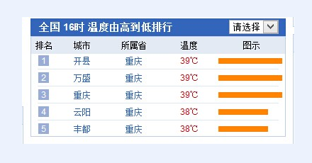 據(jù)了解,從下午13時開始,重慶各區(qū)縣便“爭先恐后”在全國高溫排行前10強(qiáng)排起隊來,從38℃到39℃。