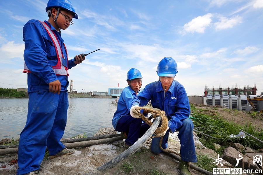 工作人員正在為身后的大型水泵站建設(shè)施放電纜半縮(央廣網(wǎng)記者 杜金明 攝)