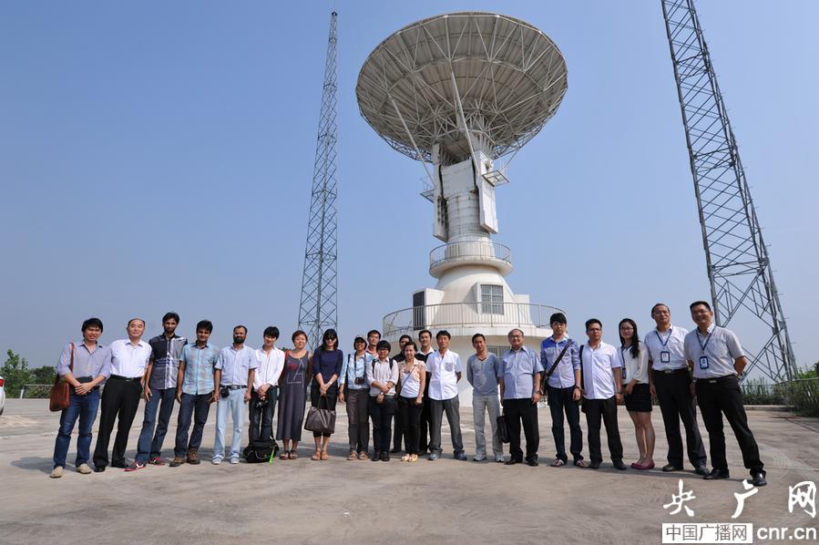 代表們在華中地區(qū)唯一的遙感衛(wèi)星地面接收站前合影(央廣網(wǎng)記者 左艾甫 攝)