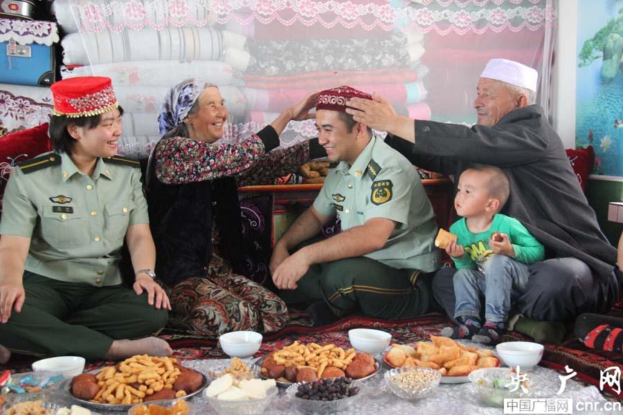 牧民黑薩甫大叔和嘉臺(tái)伊大媽為警官戴上小花帽(央廣網(wǎng)記者 吳卓勝 攝)