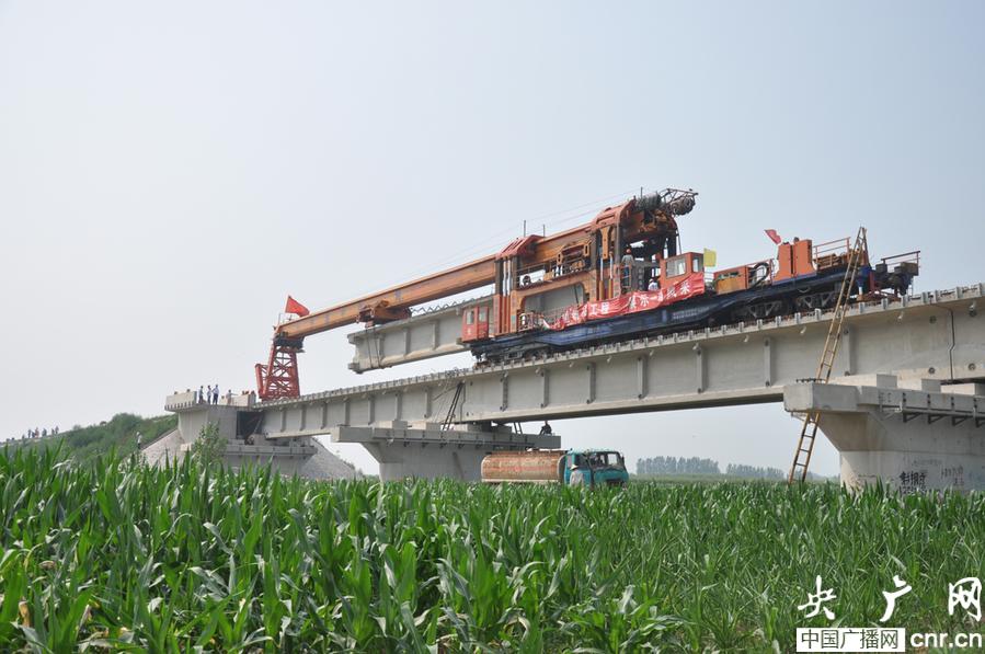 央廣網(wǎng)濟南7月30日消息(記者劉穎超 通訊員王玉建 宋源)27日下午3時,在山東省東營市利津縣五莊村西,隨著最后一孔T梁吊運到0號橋臺上,鋪架員工在橘紅色架橋機上鳴放鞭炮,喜慶黃河特大橋安全架通,這標(biāo)志著全長72.528公里的德大鐵路綜合Ⅲ標(biāo)段全線鋪通。