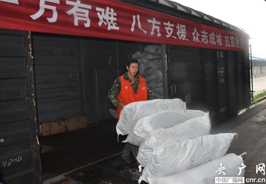 成都鐵路局搶卸第一批運抵云南昭通的衣物(央廣網(wǎng)發(fā) 吳正琪 攝)