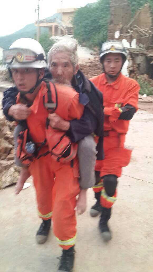 12時20分,突擊隊冒著高溫酷暑,在連續(xù)陡坡的鄉(xiāng)間小道上急行軍30分鐘,到達彎子頭村,并迅速勘察現(xiàn)場,了解被困群眾基本情況得知,今年33歲的劉思平因患精神病,經(jīng)常無端傷害家人和其他群眾,在純屬無奈的情況下,一年前被家人用鐵鏈講手腳鎖住關(guān)在家中,8月3日地震造成家中房屋部分坍塌,好在劉思平的房間只有后墻向外倒塌,劉思平也因地震徹底被困家中,由于不斷的余震,他隨時都有生命危險。救援隊和村干部商量以后,村干部先穩(wěn)住他的情緒,消防隊員首先撬開已經(jīng)變形的房門,從倒塌的后墻將鐵鎖和鐵絲撬開,然后再村干部的配合下,消防隊員冒著隨時可能倒塌的危險,先清除埋壓鐵鎖的木頭和泥土,其他隊員、村干部和他聊天,經(jīng)過10分鐘緊張救援,消防隊員打開了鐵鎖和鐵絲,消防隊員和村干部將其“騙出”屋內(nèi),順利將其轉(zhuǎn)移到安全地方。