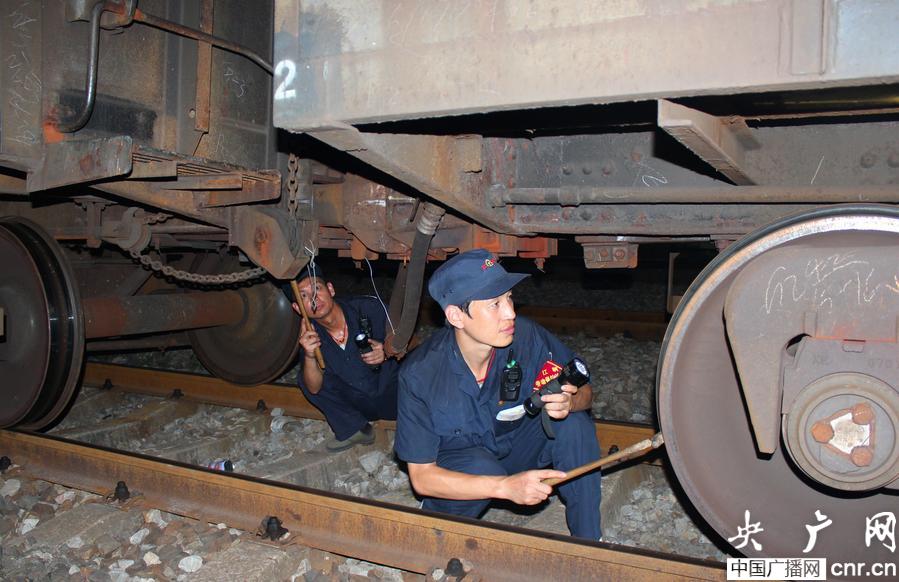 武漢鐵路局江岸車輛段列車檢修員精心挑選車輛(央廣網發(fā) 秦濤 攝)