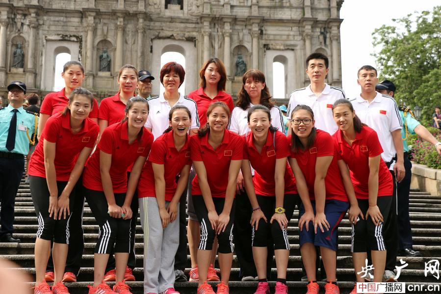 女排姑娘們在大三巴牌坊合影留念(央廣網(wǎng)記者 毛強(qiáng) 攝)