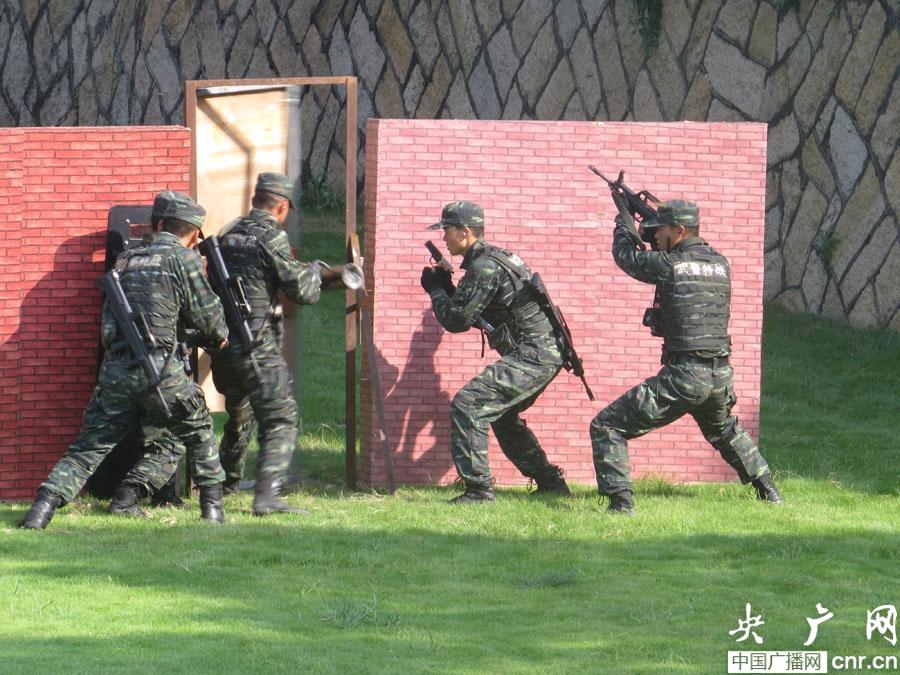 針對房屋、飛機、路面交通工具等復雜條件下的突入戰(zhàn)斗實彈射擊演練(央廣網記者 陳庚 攝)