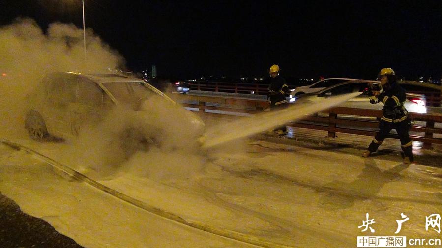 央廣網(wǎng)廈門8月21日消息(記者 陳庚 通訊員 陳榮亮 李嘉城)今晚19時25分許,廈門海滄大橋出島方向,一輛轎車在行駛中起火燃燒,汽車瞬間就少成了“火車”,所幸司機(jī)快速逃生,火災(zāi)沒有造成人員傷亡。事故發(fā)生時正值交通高峰期,橋面上車輛擁堵,廈門消防特勤一中隊(duì)官兵只得通過橋上的應(yīng)急車道趕赴事故現(xiàn)場。起火轎車在海滄大橋出島方向中段,消防官兵到達(dá)現(xiàn)場時,轎車已經(jīng)處于猛烈燃燒階段,車頭部分被大火籠罩,車廂內(nèi)也已經(jīng)被引燃,火勢已經(jīng)快燒到轎車右側(cè)油箱,整輛轎車成了“火車”,人員根本無法靠近,橋面上兩個車道被堵,大量汽車無法通行。根據(jù)現(xiàn)場情況,消防官兵對現(xiàn)場進(jìn)行警戒,同時利用消防車出泡沫,向起火轎車噴射。10分鐘后,轎車的明火被撲滅。隨后,消防官兵將起火轎車的引擎蓋撬開,向發(fā)動機(jī)內(nèi)部射水冷卻。19時45分,火災(zāi)被完全撲滅。在事故現(xiàn)場約10米處,停著一輛轎車,據(jù)了解,起火轎車曾與前方車輛追尾,司機(jī)下車查看后,發(fā)現(xiàn)車頭冒煙起火,隨后很快蔓延燃燒。