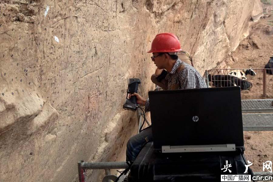 專家對(duì)巖畫進(jìn)行近距離顯微觀察與數(shù)字化分析(央廣網(wǎng)記者 張雷 攝)
