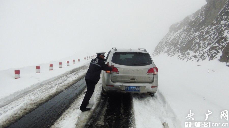 海北州祁連縣公安局交警大隊(duì)民警攜帶鐵鍬等工具迅速趕往冰溝達(dá)坂山頂。短短幾個(gè)小時(shí),冰溝達(dá)坂山頂?shù)姆e雪已有一米多深,能度不足十米。民警們到達(dá)現(xiàn)場(chǎng)后一面搜救被困群眾一面分流車輛疏導(dǎo)交通。民警們和被困駕駛員一起,在風(fēng)雪中清雪撒沙、推車、裝防滑鏈,直到傍晚時(shí)分,所有被困車輛全部通過冰溝達(dá)坂。