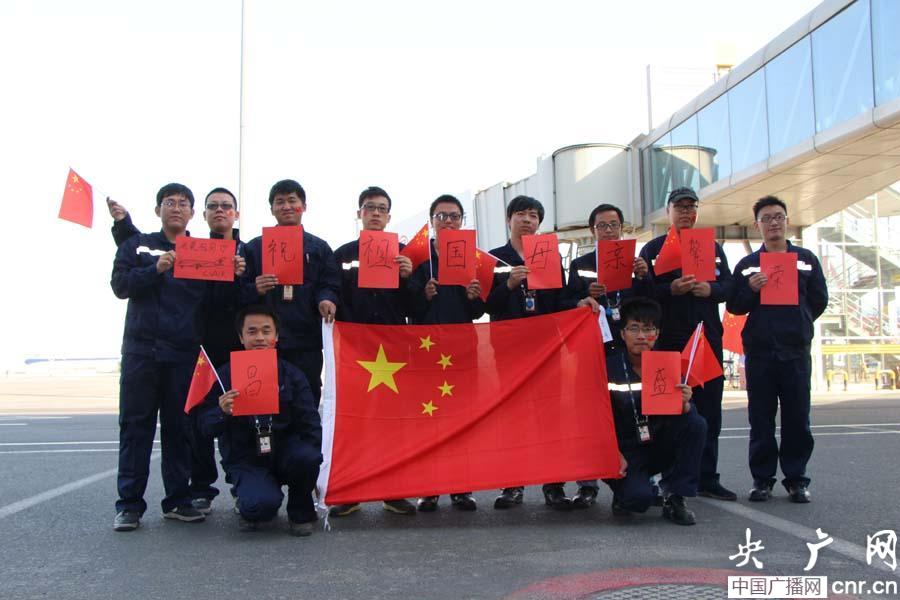 一整天的揮汗如雨,小伙子們順利完成了全部定檢任務(wù),在工作結(jié)束后,大家拿著寫滿祝福的紅紙站在國旗下合影留念!皣鴳c節(jié)到了,我們會(huì)認(rèn)真做好每一架飛機(jī)客艙的檢查和維修,用最棒的客艙環(huán)境迎接旅客,用出色工作業(yè)績(jī)?yōu)樽鎳I(xiàn)禮!”車間團(tuán)支部書記陳峰自信地說。