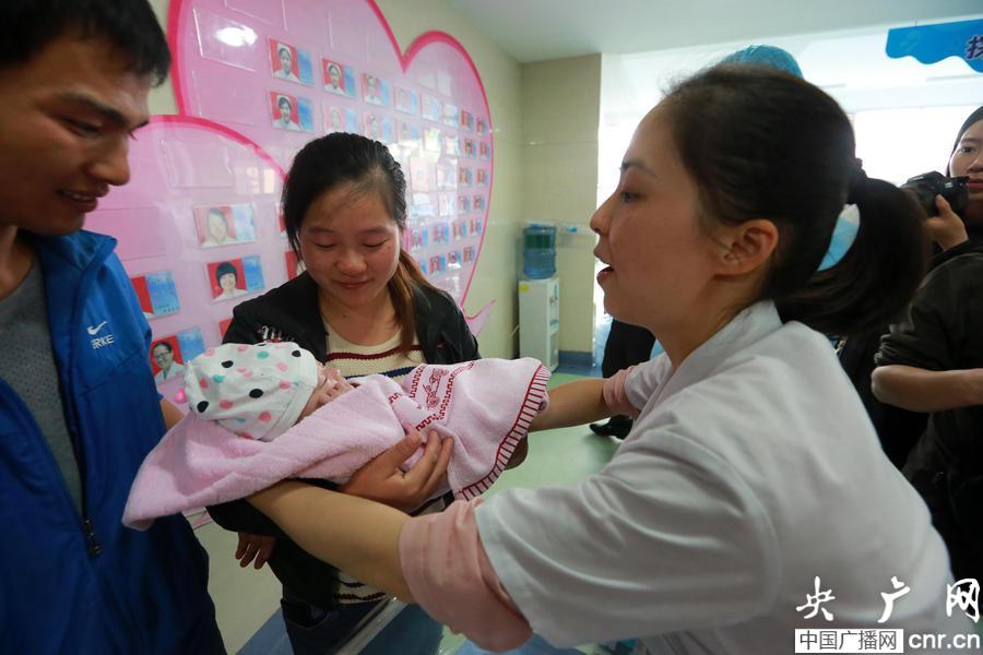 10月23日,湖南省婁底市袖珍嬰兒媽媽在婁星區(qū)婦幼保健院高興接過兒子彭安康(央廣網(wǎng)發(fā) 郭國權(quán) 攝)
