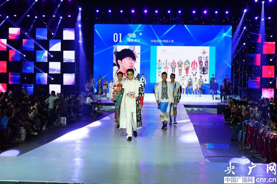 第二屆“園洲杯”全國休閑服裝設(shè)計大賽金獎1號周骉作品《戲如人生》(組委會提供)(央廣網(wǎng)記者 何偉奇 攝)