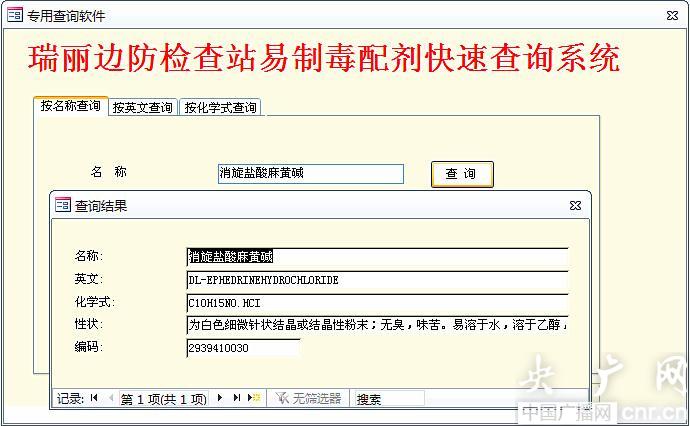 根據(jù)口岸查緝工作的需求,該系統(tǒng)共設(shè)定了按中、英文品名和化學(xué)分子式三個(gè)條件準(zhǔn)確查詢,同時(shí)考慮了因商品名稱變化而導(dǎo)致的無(wú)效查詢和錯(cuò)誤,增加模糊查詢功能,可在查詢中對(duì)近似品名的中、英文品名和化學(xué)分子式及性狀特點(diǎn)進(jìn)行列舉查詢,較好地解決了在口岸一線查緝工作人工查閱中、英文及化學(xué)分子式對(duì)照耗費(fèi)時(shí)間長(zhǎng)、易出差錯(cuò)的問(wèn)題。在該系統(tǒng)配發(fā)前臺(tái)使用后,口岸查緝效能得到了大幅提高。