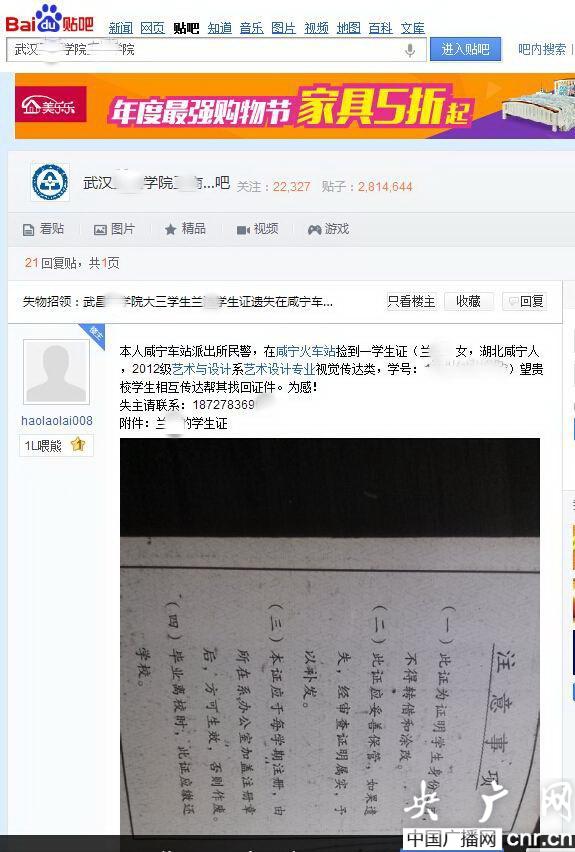央廣網(wǎng)武漢11月5日消息(記者張毛清 通訊員馮暢)武昌某學(xué)院的大三學(xué)生小蘭最近在學(xué)校的貼吧里看到鐵路民警發(fā)布的失物招領(lǐng)帖子,驚喜地從鐵路民警處找回了遺失的學(xué)生證。鐵路民警通過網(wǎng)絡(luò)新媒體用心尋找失主的事情,一時間在該校貼吧上獲得贊譽一片。