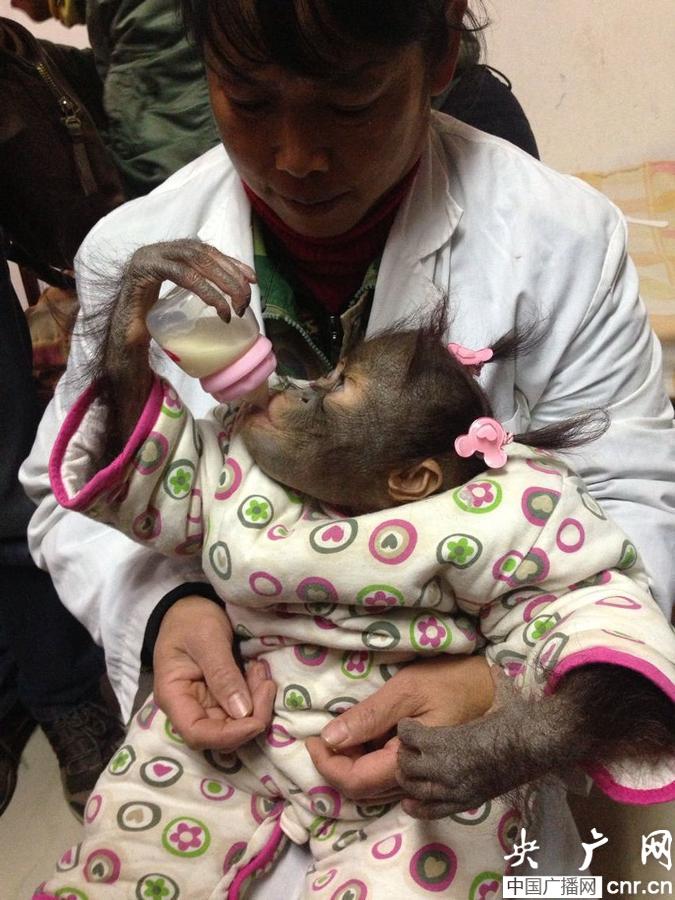 最后,飼養(yǎng)員來(lái)到野生動(dòng)物園后被基地的育嬰室為紅毛猩猩二毛進(jìn)行檢查。而毛要檢查的項(xiàng)目有兩項(xiàng),第一項(xiàng)是測(cè)試二毛的智力。將奶瓶懸掛在二毛的籠舍里,若二毛能自己想辦法吃到奶瓶的奶,就證明二毛的智力是正常的,奶瓶掛上籠舍后,紅毛猩猩二毛很快的攀爬到一定的高度,一手拉著籠子,一手去抓奶瓶,將奶嘴塞進(jìn)自己的嘴里。測(cè)完智力后開(kāi)始測(cè)量體溫,獸醫(yī)首先對(duì)體溫計(jì)進(jìn)行消毒。將體溫計(jì)夾在二毛的腋下,時(shí)間到了以后拿出體溫計(jì),體溫計(jì)上面的溫度為37.8℃,獸醫(yī)稱(chēng)二毛的體溫為正常。
