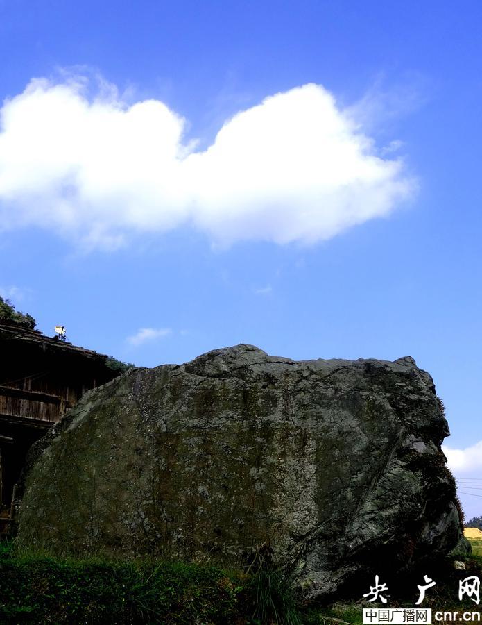 更為驚奇的是,這個二十來戶的苗寨還有10多個巨大石頭“相伴”,且全部是由一塊組成,屬于單體巨石。其中最小至少300噸重,最大達(dá)400多噸。這些巨石往往安插在兩棟木房中間,遠(yuǎn)看像一座“小山”,恰好成為了這里苗家的天然“墻壁”,這實屬罕見。經(jīng)觀察,10多塊巨石表面不規(guī)則,多呈暗灰色。由于石頭大,附近農(nóng)戶多用其來當(dāng)“曬場”。