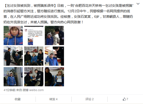 “合肥百花井乞討女孩”被警方找到 非拐賣