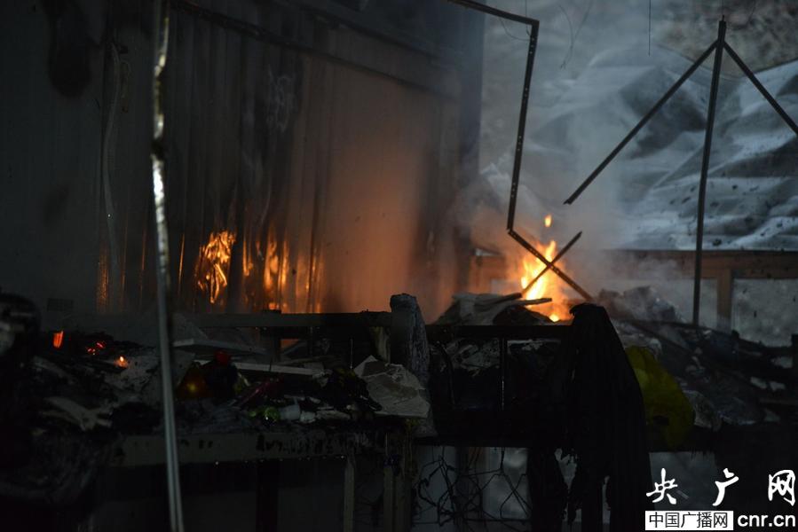 板房?jī)?nèi)正在燃燒的民工床鋪(央廣網(wǎng)發(fā) 陳玉 攝)