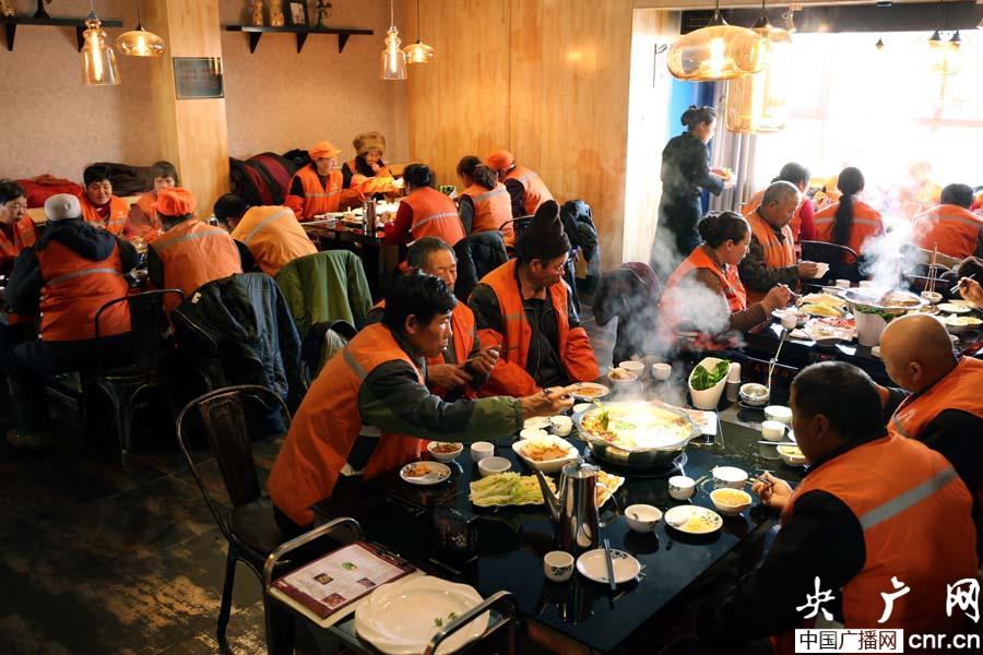布爾津縣麻辣驛站火鍋店特別邀請(qǐng)全縣環(huán)衛(wèi)工人一起吃餃子過冬至(央廣網(wǎng)發(fā) 蔣葉軍、姚江波攝)