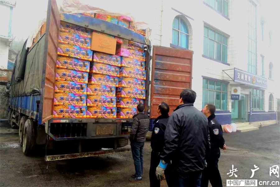 12月27日上午,威寧縣交警大隊(duì)二中隊(duì)民警在查看非法販運(yùn)的煙花爆竹車輛。(圖片由貴州威寧縣交警二中隊(duì)提供)