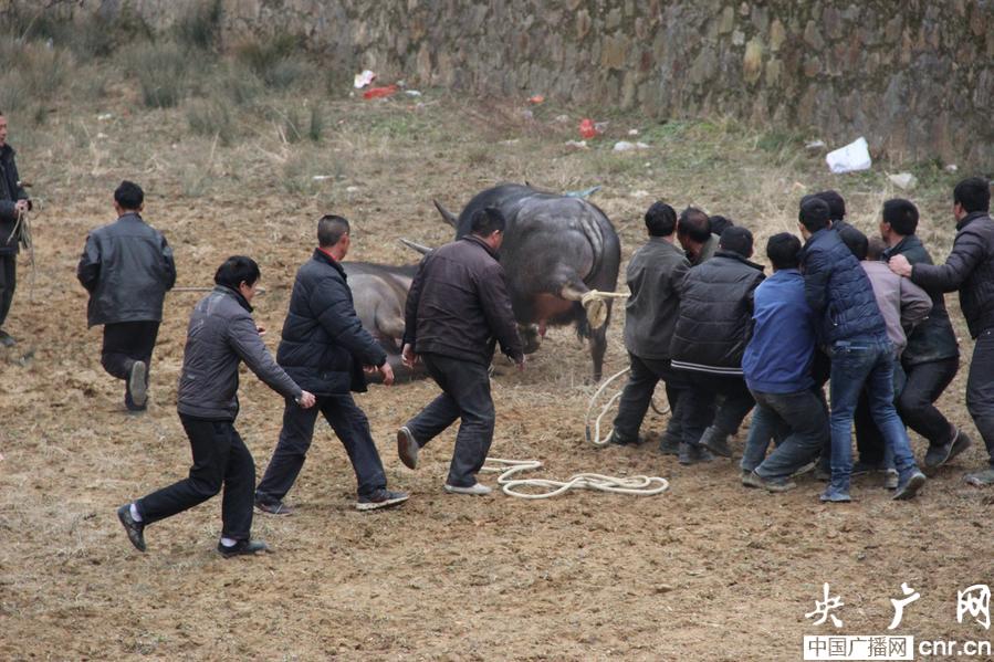 央廣網(wǎng)錦屏1月2日消息(記者王珩 孟海通訊員石福濤 楊。2015年1月1日14時(shí)許,在貴州錦屏縣彥洞鄉(xiāng)黃門(mén)村的斗牛場(chǎng),隨著斗牛協(xié)會(huì)會(huì)長(zhǎng)王明益的一聲尖銳哨聲的吹響,前來(lái)觀看斗牛比賽的二十來(lái)個(gè)年輕侗寨小伙涌入牛場(chǎng),兵分兩組將一對(duì)打斗了三分余鐘還分不出勝負(fù)的水牛拉住,這是錦屏2015年元旦節(jié)期間黃門(mén)侗寨舉行斗;顒(dòng)的一角。