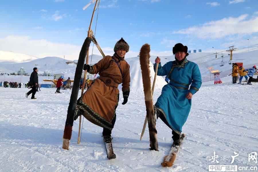 開幕式現(xiàn)場(chǎng),阿勒泰市唯一的蒙古民族鄉(xiāng)——汗德尕特鄉(xiāng)的蒙古族同胞還向國(guó)內(nèi)外游客展示古老的射箭游戲,一人多高的蒙古長(zhǎng)弓,沒有箭鏃的木箭,雪地上支起的一張獸皮當(dāng)箭靶,男女老少皆宜,在場(chǎng)的游客個(gè)個(gè)躍躍欲試。