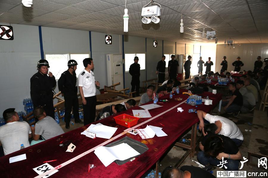 經(jīng)兩個多月秘密偵查后,去年5月23日,由湖北省公安廳治安總隊直接協(xié)調(diào)調(diào)度,孝感市警方出動200余名民警直奔武漢,直撲窩點。賭點設在位于沌口漢洪高速入口附近的一個河堤旁,是一個面積約300平方米,隱藏在一處低洼地的簡易活動板房,只有一個供車輛出入的通道。半小時后,包括賭場老板孫某、二號人物劉某在內(nèi)的120余名涉賭人員悉數(shù)落網(wǎng),民警現(xiàn)場繳獲賭資80多萬元,收繳管制刀具12把及冰毒若干。