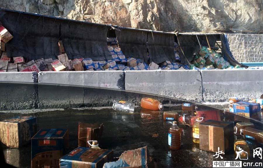 央廣網(wǎng)烏魯木齊1月18日消息(記者張雷、通訊員伊力哈木)今天下午14:23,新疆烏魯木齊至吐魯番方向G30高速公路3499公里處,一輛拉運(yùn)食用油的貨車側(cè)翻,塑料桶裝食用油散落公路,食用油從破損的塑料桶中流出,路面油滑車輛無法行駛,造成大量車輛和人員滯留。
