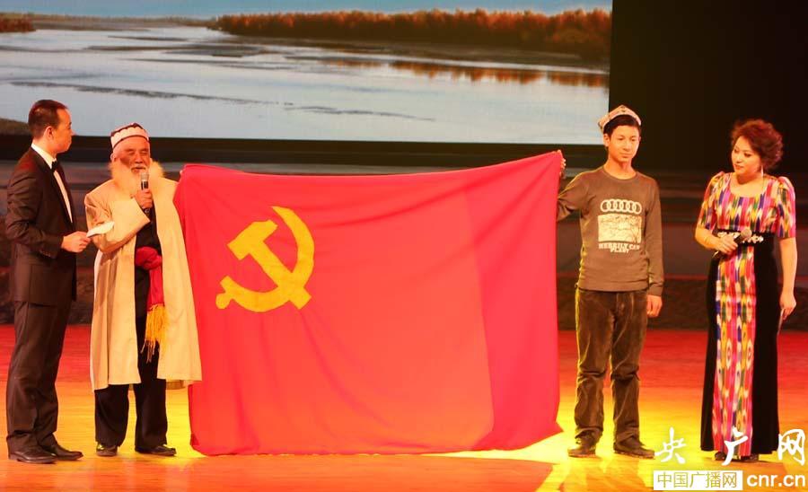 78歲老黨員肉孜阿尤甫、18歲年輕黨員麥麥提尼牙孜獻(xiàn)上鄉(xiāng)親們手繡的黨旗(央廣網(wǎng)記者 張雷 攝)