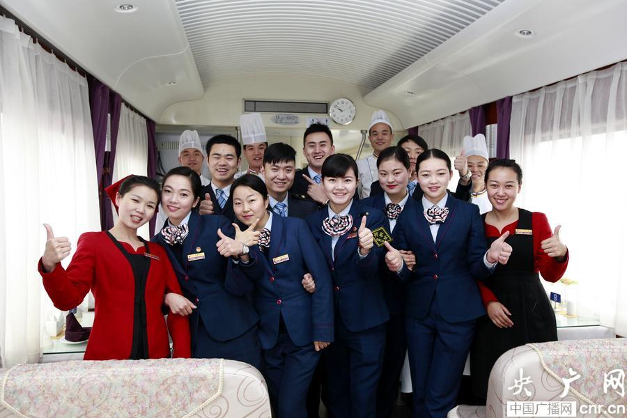 1月30日列車始發(fā)前,成都客運(yùn)段Z50次九組列車工作人員以良好的精神面貌迎接2015年春運(yùn)的到來(lái)。(央廣網(wǎng)發(fā) 胡志強(qiáng)攝)