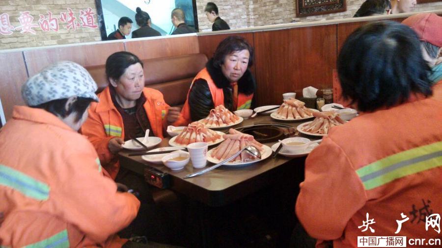 2月11日,山西朔州市某火鍋店請40名環(huán)衛(wèi)工吃年夜飯。崔小林 攝