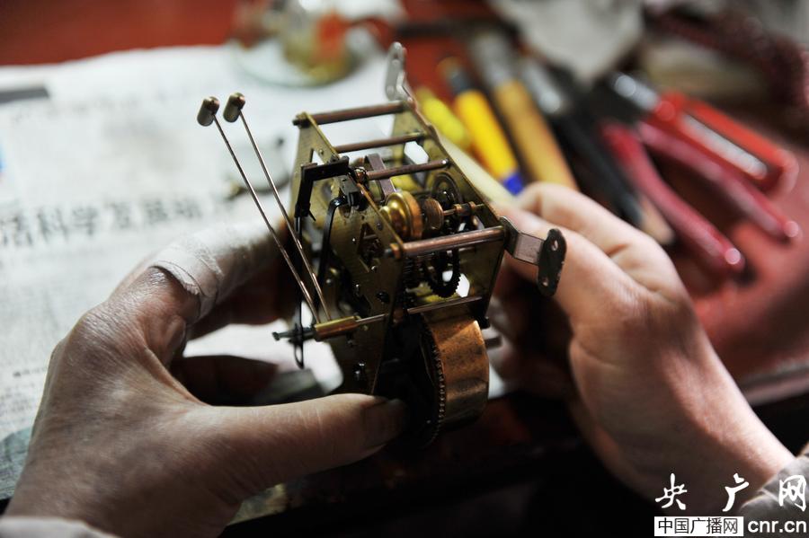 2月11日,侯懷泉在修理一款老式鐘。(央廣網(wǎng)發(fā) 謝順 攝)