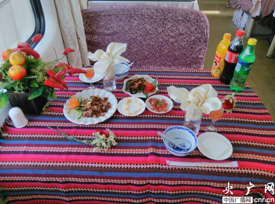 “哇,沒想到火車上也能這么浪漫!”張亞楠看著條紋民族風的桌布、花朵型的餐布、透亮的高腳杯和與滿天星扎在一塊的玫瑰花瓣,驚呼道。