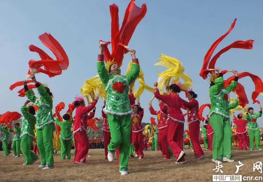 震天的鑼鼓敲起來(lái),歡快的秧歌扭起來(lái)。在奇臺(tái)縣體育場(chǎng),來(lái)自全縣15個(gè)鄉(xiāng)鎮(zhèn)社火團(tuán)們身著節(jié)日的盛裝,帶著飽滿的熱情,為群眾帶來(lái)精彩的表演。在鏗鏘的鼓點(diǎn)聲中,奇臺(tái)鎮(zhèn)秧歌隊(duì)鑼鼓喧天,彩練飛舞。碧流河鄉(xiāng)社火隊(duì)巨龍飛躍,醒獅翻騰,向觀眾頻頻致意,表達(dá)美好祝愿!