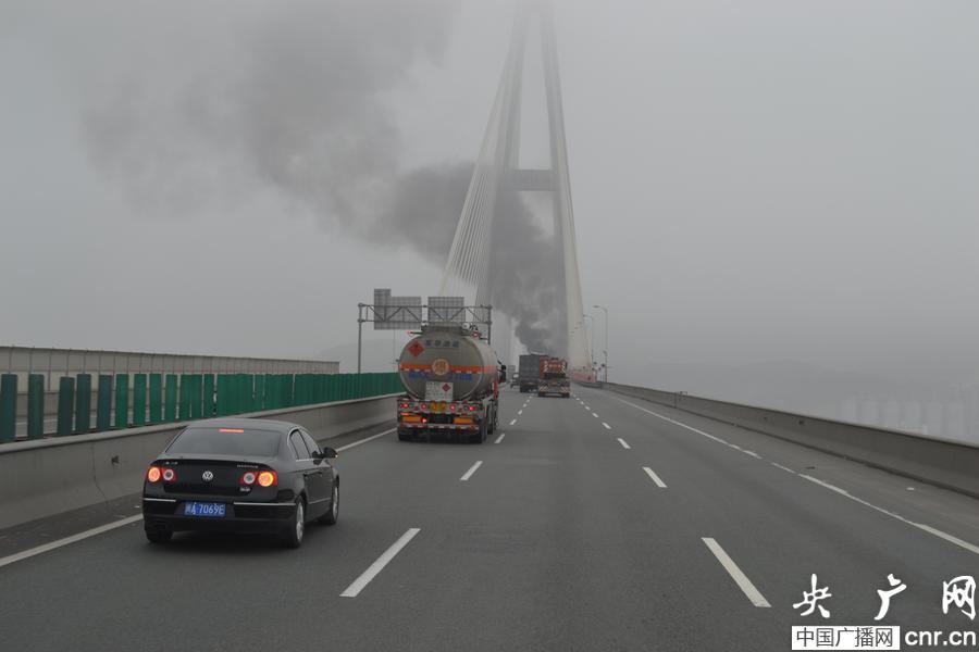 福州:一輛貨車行駛在青洲大橋途中起火(央廣網(wǎng)發(fā) 黃綠榮 攝)