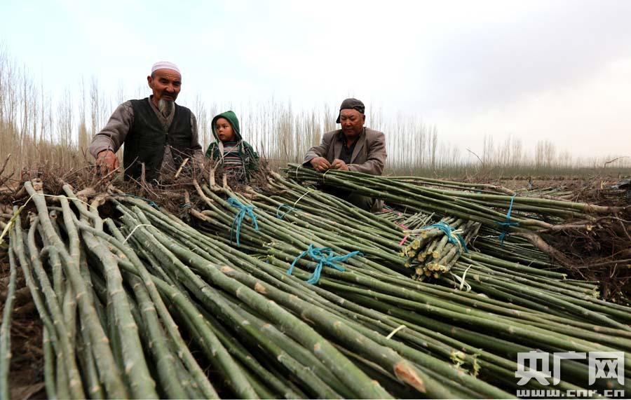 央廣網(wǎng)焉耆4月2日消息(記者張雷 通訊員董基春)昨天,新疆焉耆回族自治縣七個(gè)星鎮(zhèn)桑巴巴克次村七組農(nóng)民道不代正在地里扎捆楊樹苗,道不代種植了8畝青楊苗木,往年可賣六、七萬(wàn)元,而今年才賣了一萬(wàn)多元,他為此顯得十分失落。